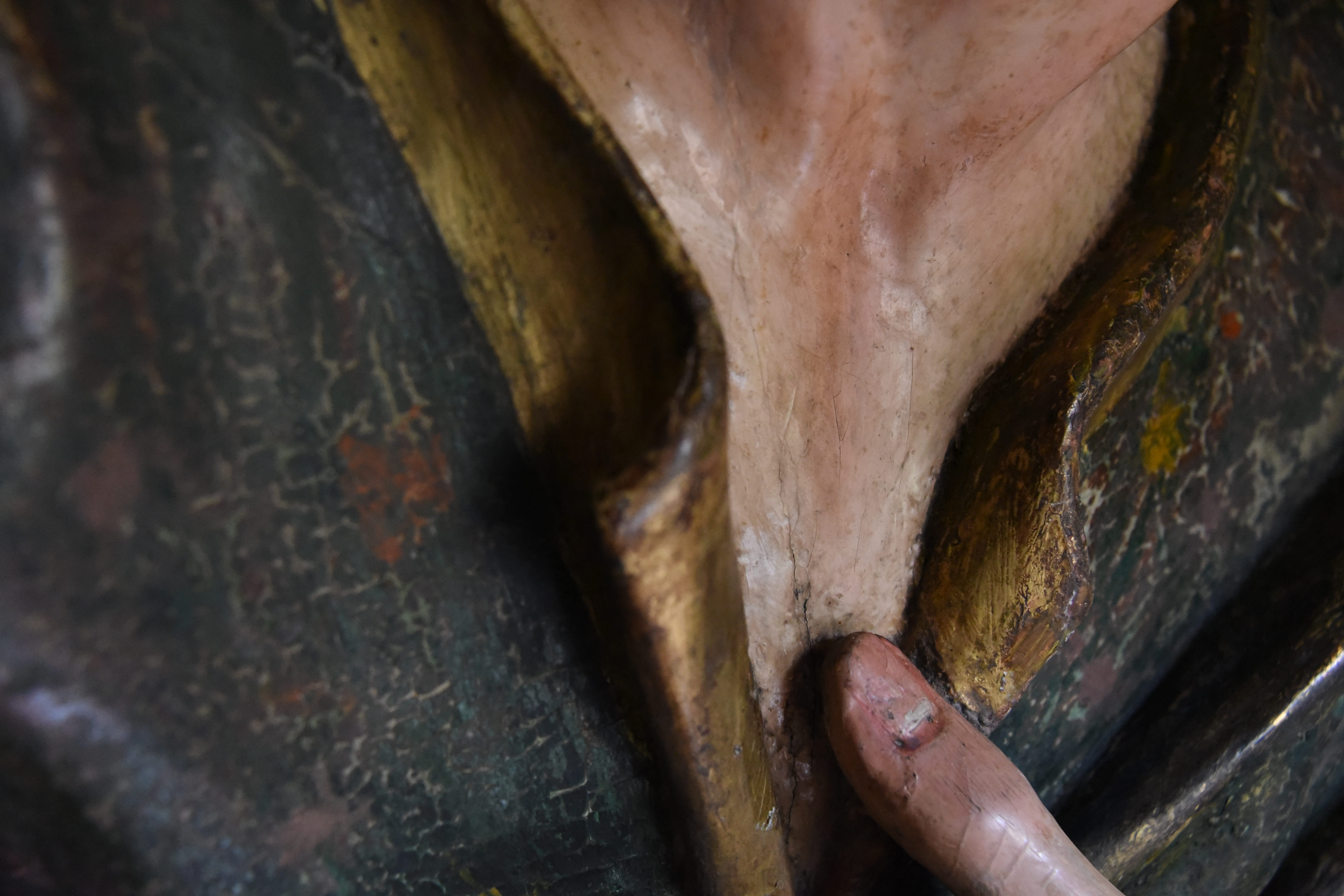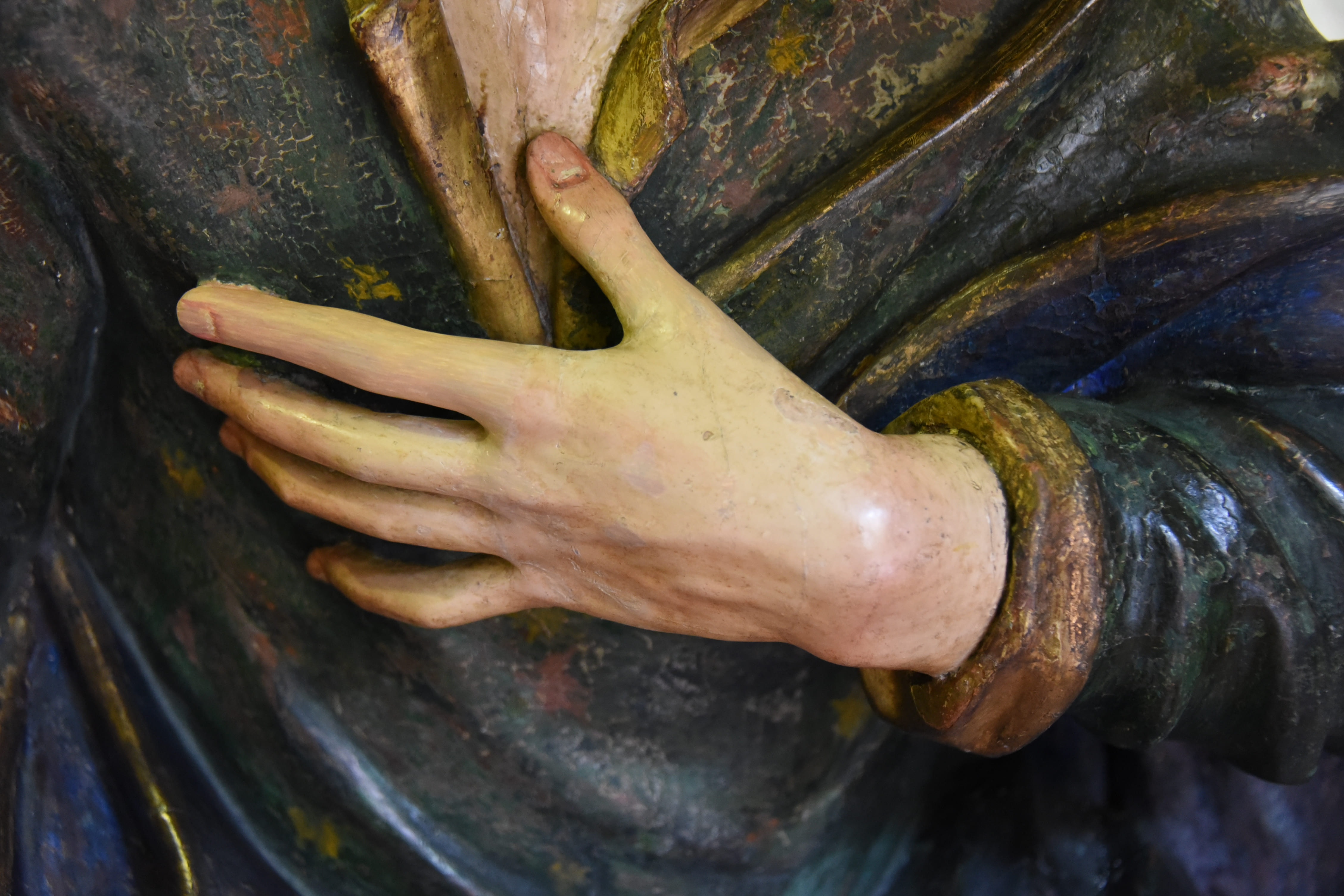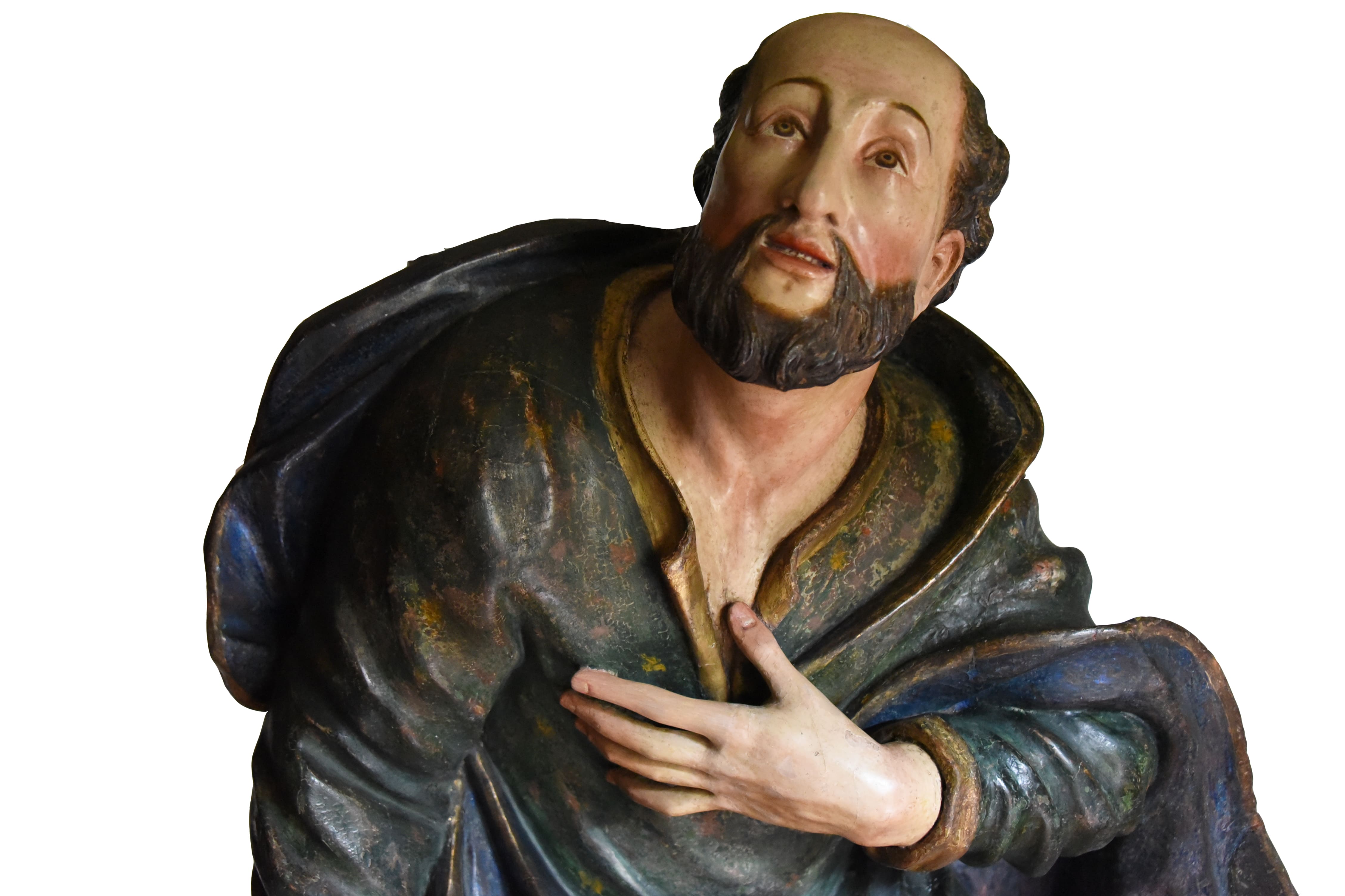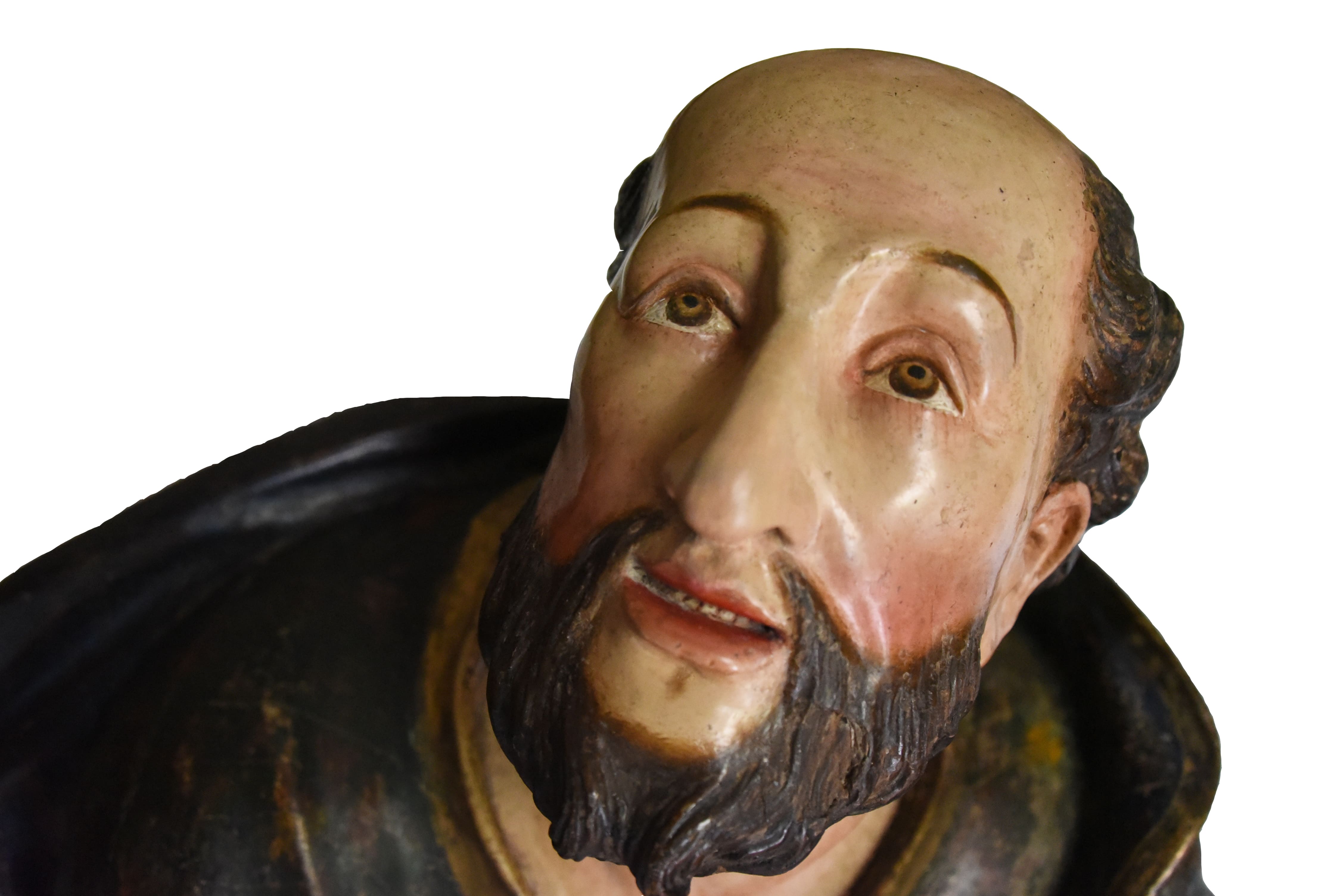 Habría sido parte del Altar del Santo Cristo, junto a la escultura de Santa Ana y Cristo crucificado, figuras que habrían sido fabricadas originalmente para la Iglesia de San Miguel. Después del gran incendio que la destruyó en 1769, fueron trasladadas a la Catedral.
