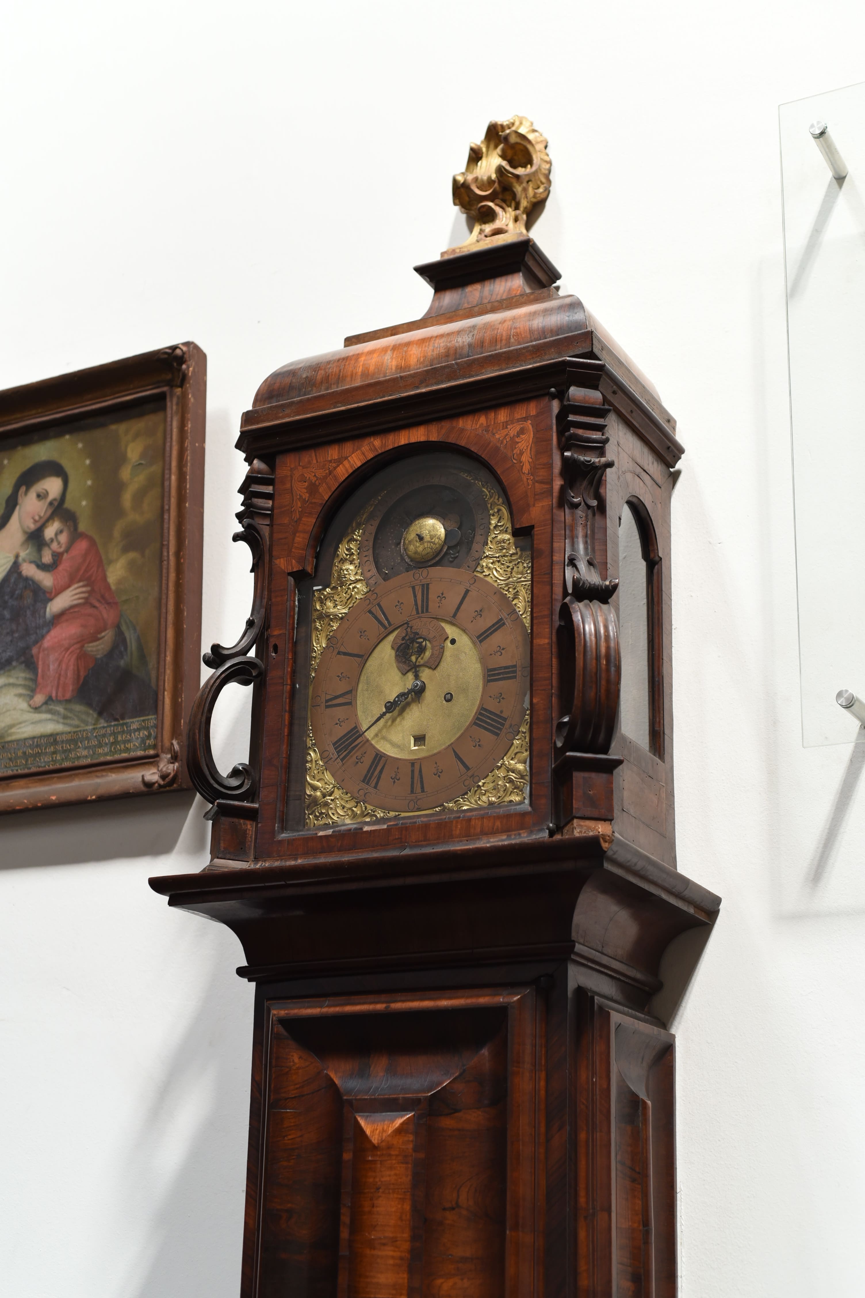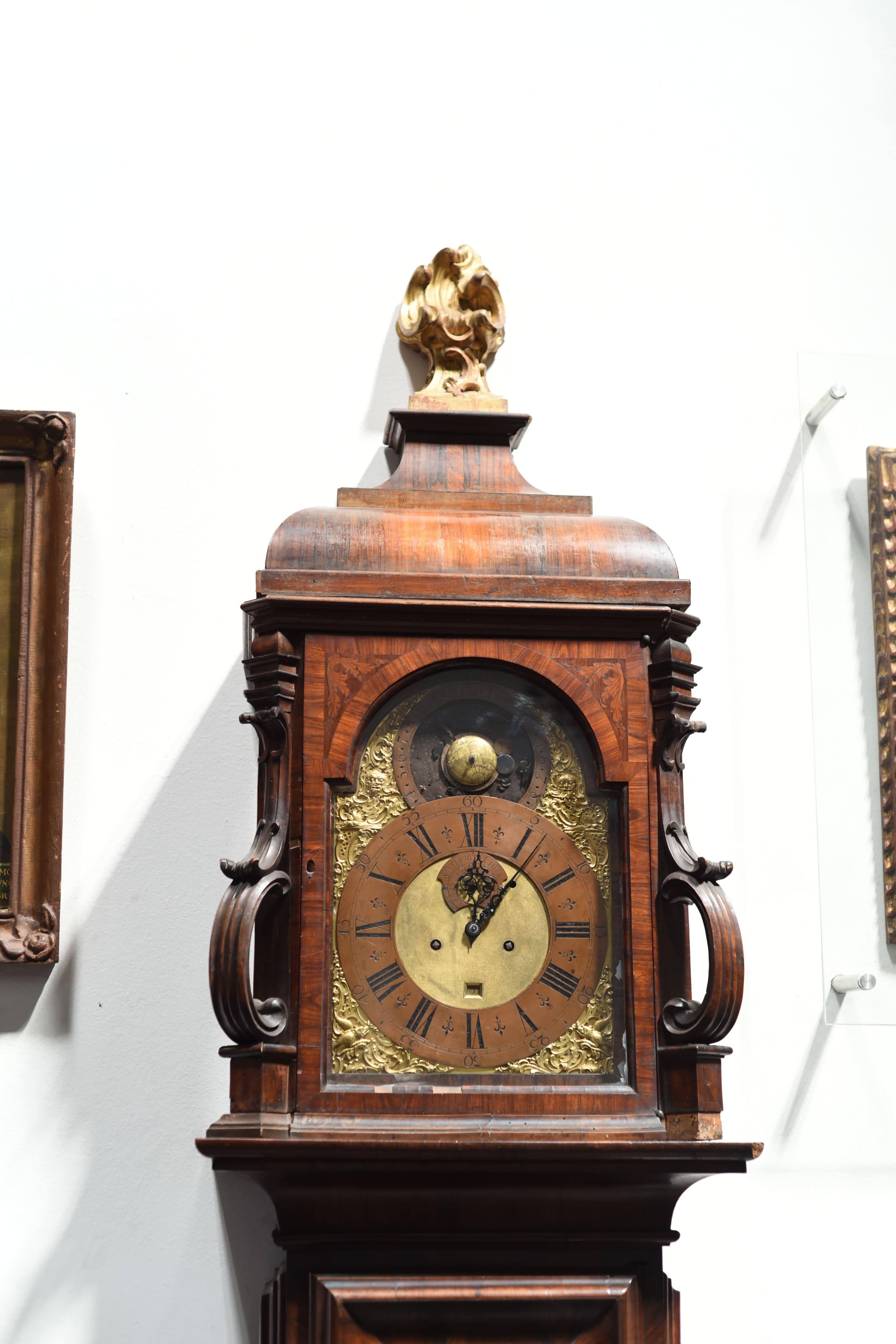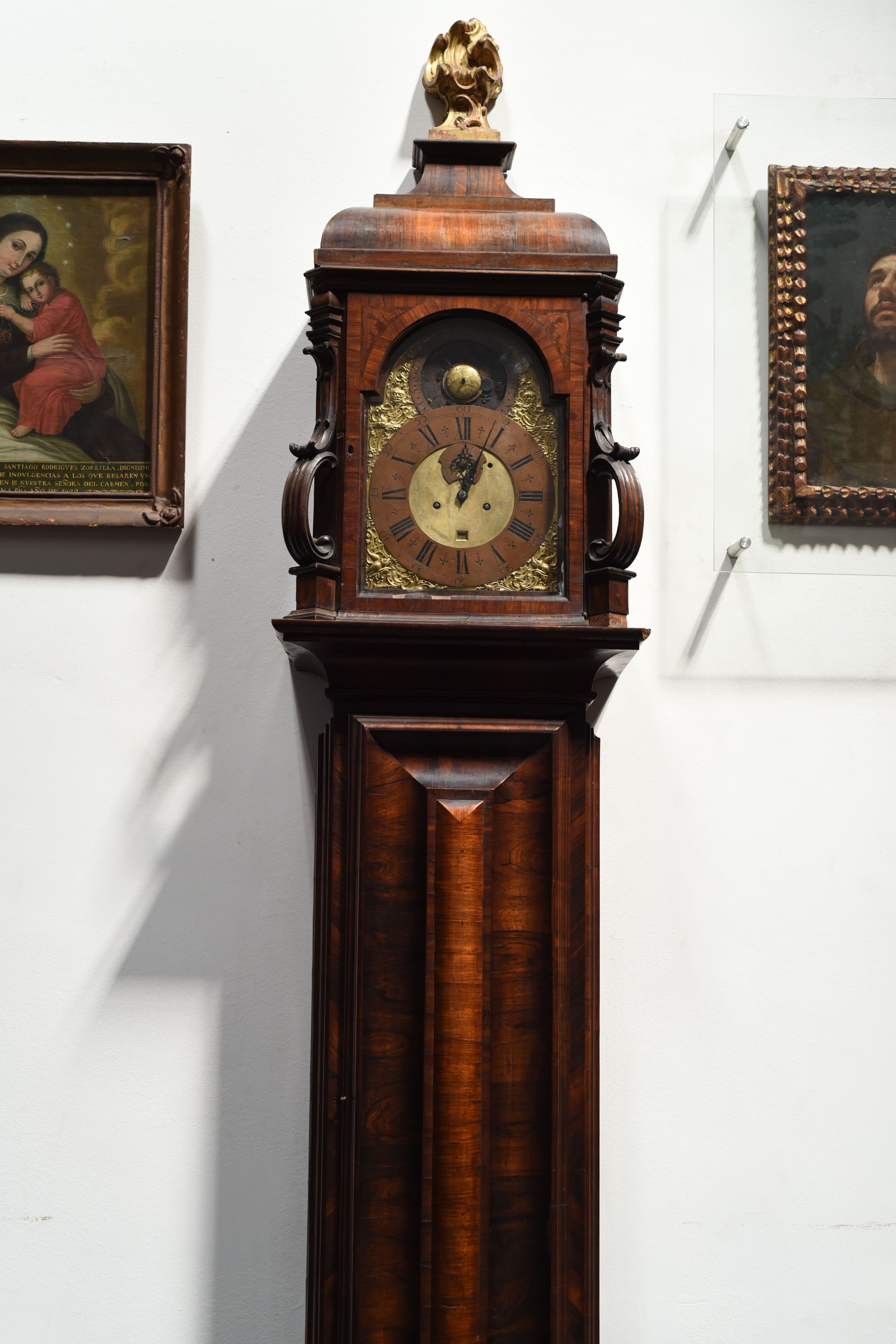 El mueble de este reloj está fabricado en madera de caoba y tiene aproximadamente 210 centímetros de altura. Posee ornamentos de formas simples y un remate dorado en su extremo superior.